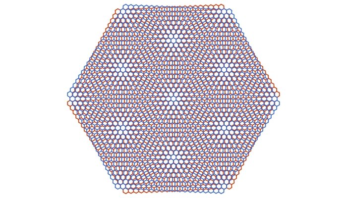 MITトラップは、モアレ超格子と呼ばれるグラフェン構造で、上の画像に示すように、2つの2次元グリッドがわずかにねじれて重なり合い、より大きな規則的なパターンが表示されます。