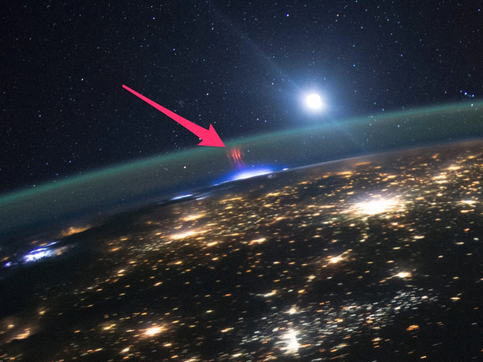 2015年にISSから撮影された、米国の赤いスプライト。 (NASA)。
